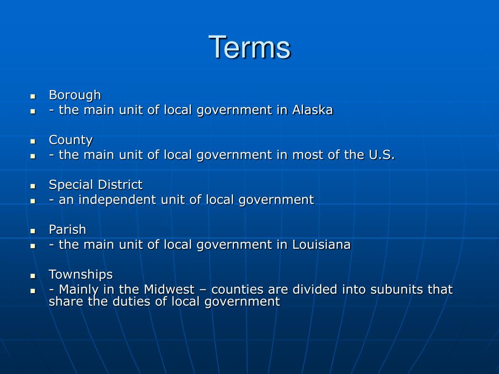 Terms • Borough • - the main unit of local government in Alaska • County • - the main unit of local government in most of the U.S. • Special District • - an independent unit of local government • Parish • - the main unit of local government in Louisiana • Townships • - Mainly in the Midwest – counties are divided into subunits that share the duties of local government