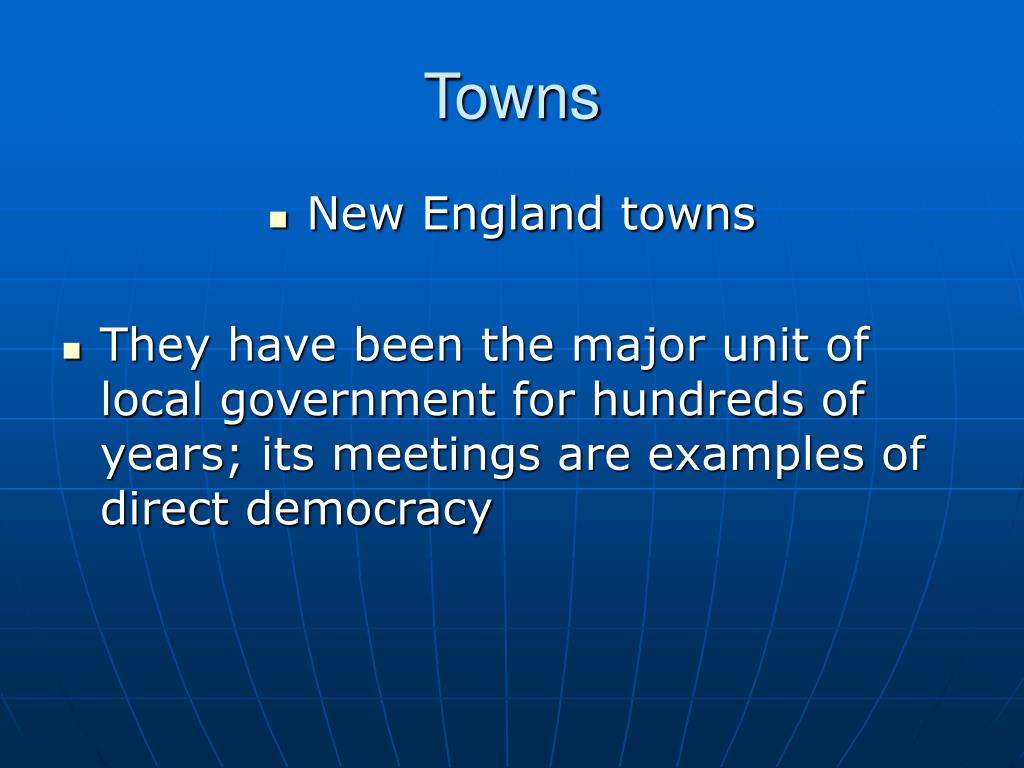 Towns • New England towns • They have been the major unit of local government for hundreds of years; its meetings are examples of direct democracy