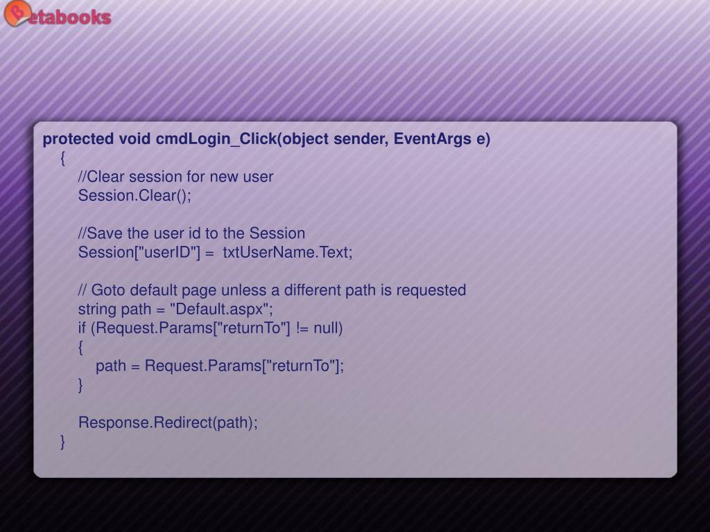 protected void cmdLogin_Click(object sender, EventArgs e) { //Clear session for new user Session.Clear(); //Save the user id to the Session Session["userID"] = txtUserName.Text; // Goto default page unless a different path is requested string path = "Default.aspx"; if (Request.Params["returnTo"] != null) { path = Request.Params["returnTo"]; } Response.Redirect(path); }