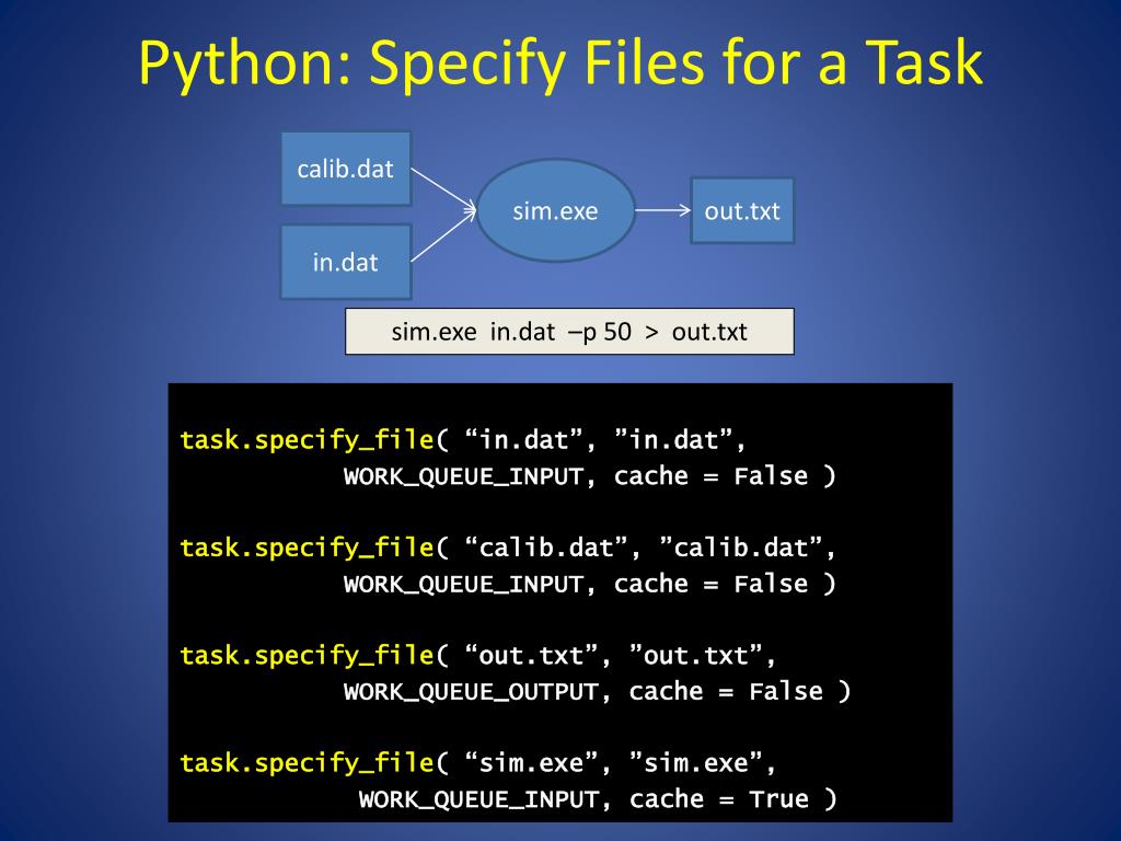 C: Specify Files for a Task calib.dat sim.exe out.txt in.dat sim.exe in.dat –p 50 > out.txt work_queue_task_specify_file( task,“in.dat”,”in.dat”, WORK_QUEUE_INPUT, WORK_QUEUE_NOCACHE ); work_queue_task_specify_file( task,“calib.dat”,”calib.dat”, WORK_QUEUE_INPUT, WORK_QUEUE_CACHE ); work_queue_task_specify_file( task,“out.txt”,”out.txt”, WORK_QUEUE_OUTPUT, WORK_QUEUE_NOCACHE ); work_queue_task_specify_file( task,“sim.exe”,”sim.exe”, WORK_QUEUE_INPUT, WORK_QUEUE_CACHE );