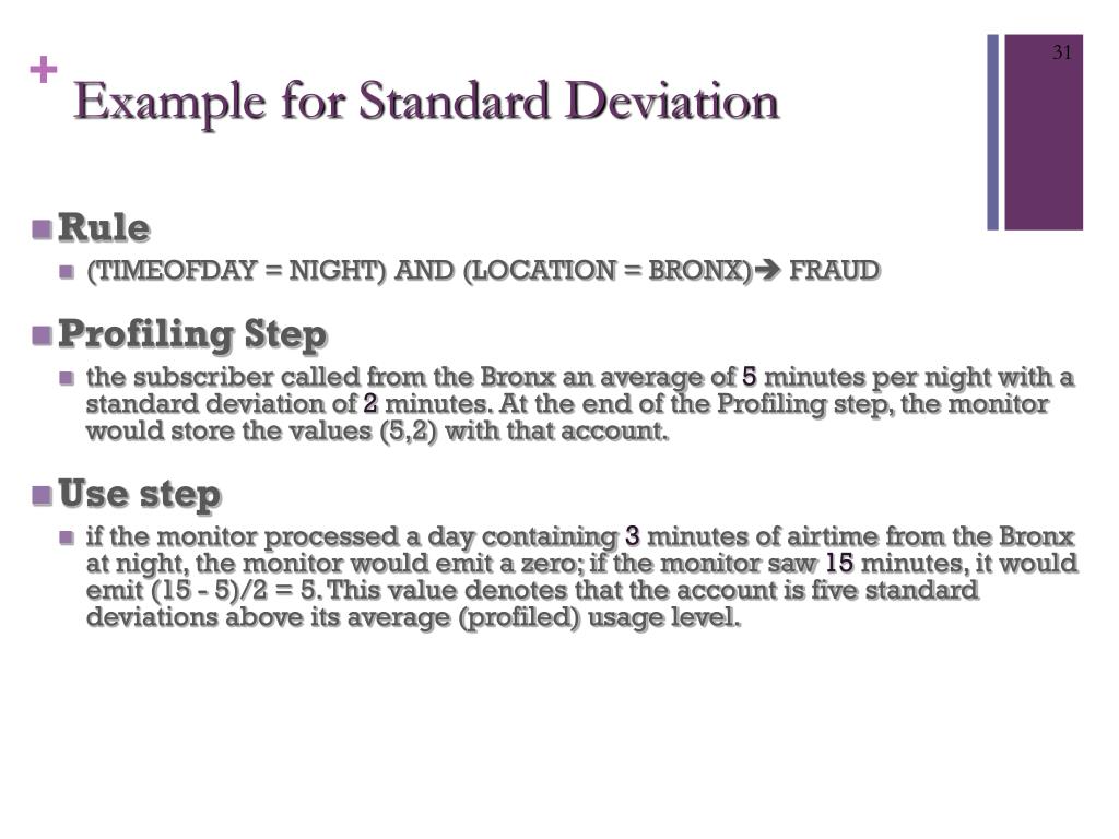 Example for Standard Deviation • Rule • (TIMEOFDAY = NIGHT) AND (LOCATION = BRONX) FRAUD • Profiling Step • the subscriber called from the Bronx an average of 5 minutes per night with a standard deviation of 2 minutes. At the end of the Profiling step, the monitor would store the values (5,2) with that account. • Use step • if the monitor processed a day containing 3 minutes of airtime from the Bronx at night, the monitor would emit a zero; if the monitor saw 15 minutes, it would emit (15 - 5)/2 = 5. This value denotes that the account is five standard deviations above its average (profiled) usage level.