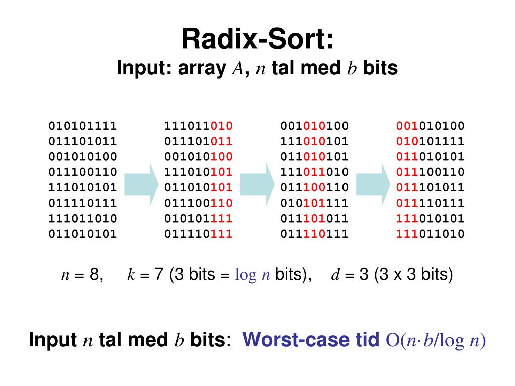 010101111 011101011 001010100 011100110 111010101 011110111 111011010 011010101 111011010 011101011 001010100 111010101 011010101 011100110 010101111 011110111 001010100 111010101 011010101 111011010 011100110 010101111 011101011 011110111 001010100 010101111 011010101 011100110 011101011 011110111 111010101 111011010 Radix-Sort:Input: array A, n tal med b bits n = 8, k = 7 (3 bits = logn bits), d = 3 (3 x 3 bits) Input ntal med b bits: Worst-case tid O(n·b/log n)