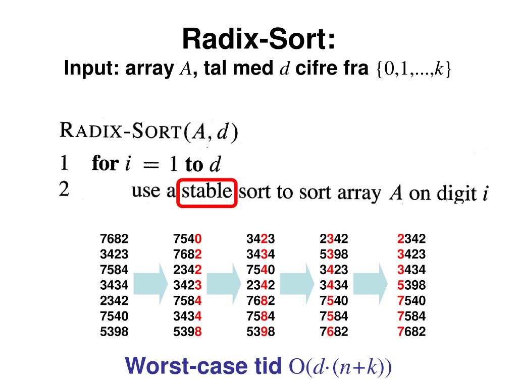 7682 3423 7584 3434 2342 7540 5398 7540 7682 2342 3423 7584 3434 5398 3423 3434 7540 2342 7682 7584 5398 2342 5398 3423 3434 7540 7584 7682 2342 3423 3434 5398 7540 7584 7682 Radix-Sort:Input: array A, tal med d cifre fra {0,1,...,k} Worst-case tid O(d·(n+k))