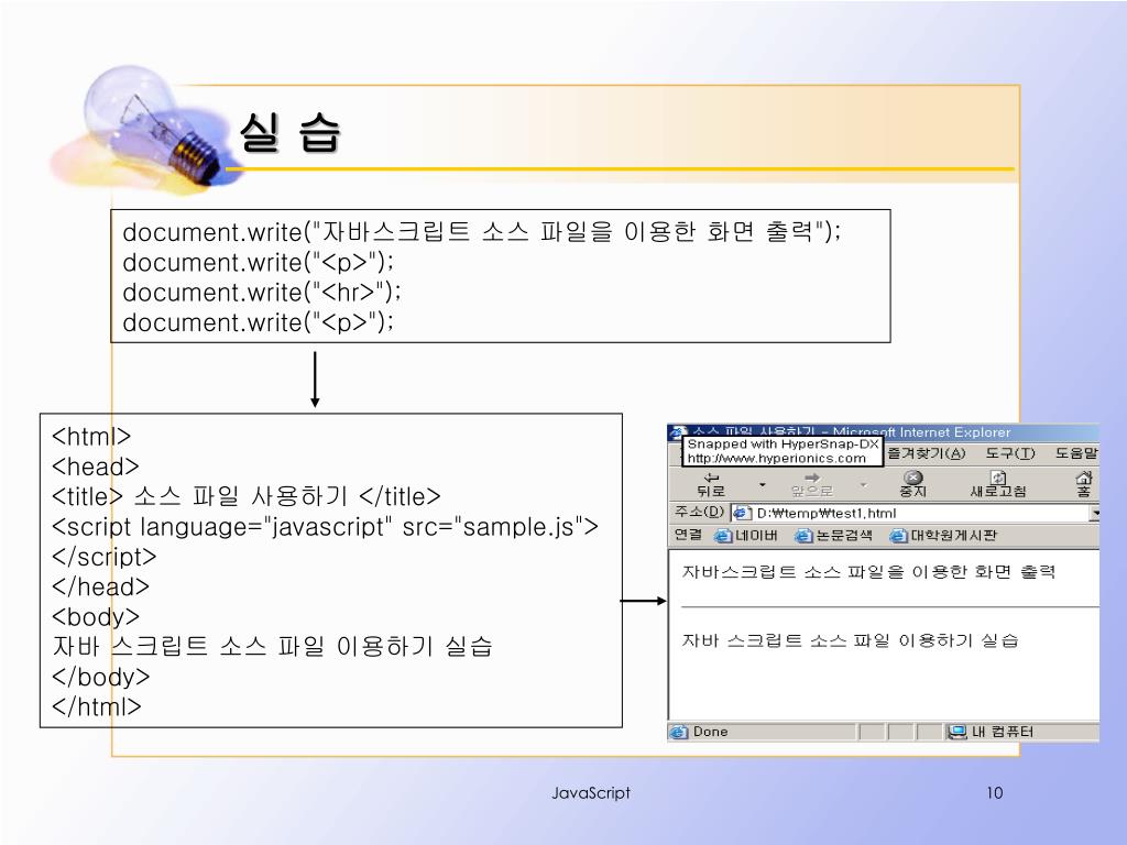 실 습 document.write("자바스크립트 소스 파일을 이용한 화면 출력");document.write("<p>");document.write("<hr>");document.write("<p>"); <html><head><title> 소스 파일 사용하기 </title><script language="javascript" src="sample.js"></script></head><body>자바 스크립트 소스 파일 이용하기 실습</body></html> JavaScript