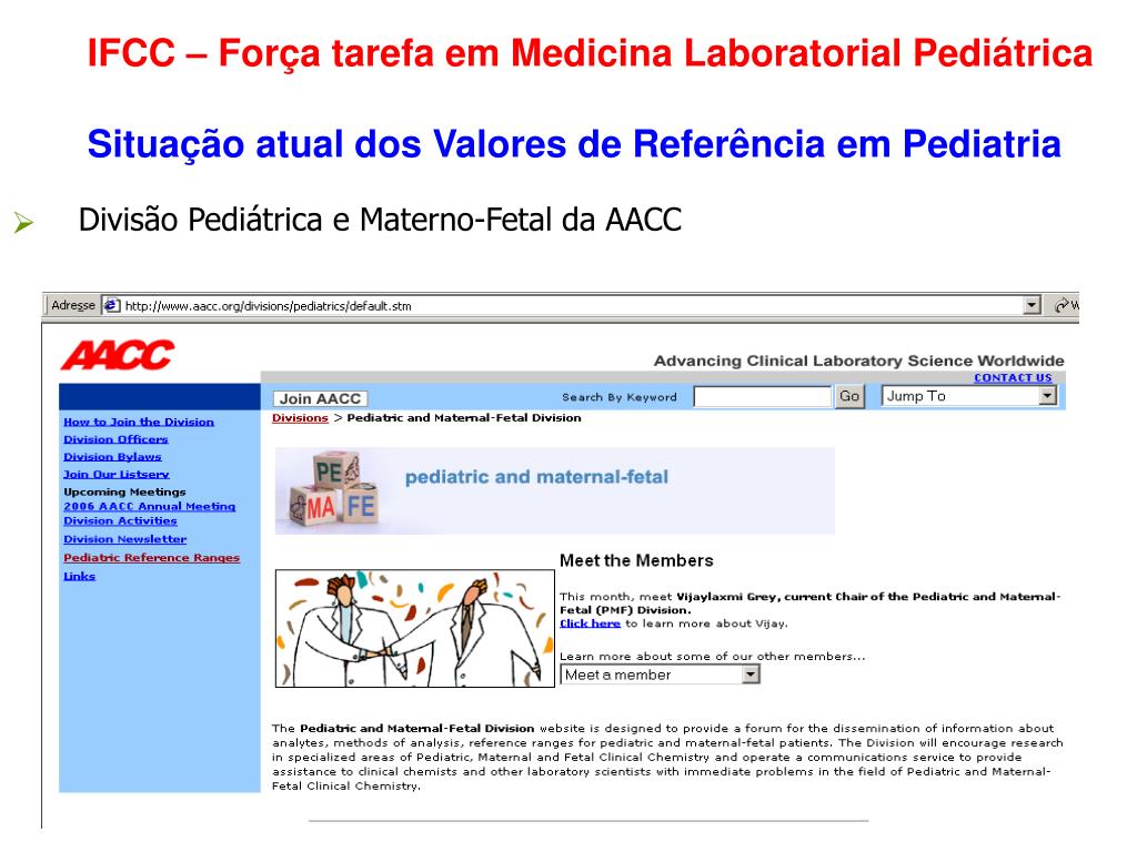 IFCC – Força tarefa em Medicina Laboratorial Pediátrica Situação atual dos Valores de Referência em Pediatria Divisão Pediátrica e Materno-Fetal da AACC