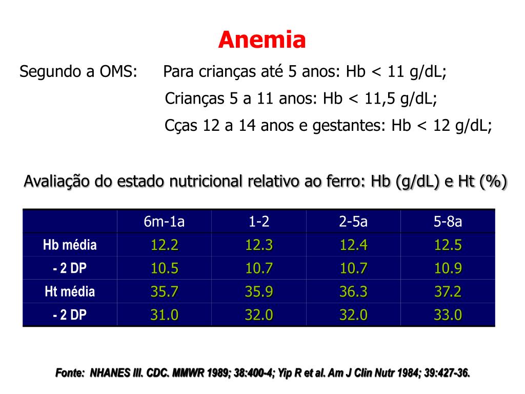 Anemia Segundo a OMS: Para crianças até 5 anos: Hb < 11 g/dL; Crianças 5 a 11 anos: Hb < 11,5 g/dL; Cças 12 a 14 anos e gestantes: Hb < 12 g/dL; Avaliação do estado nutricional relativo ao ferro: Hb (g/dL) e Ht (%) Fonte: NHANES III. CDC. MMWR 1989; 38:400-4; Yip R et al. Am J ClinNutr 1984; 39:427-36.