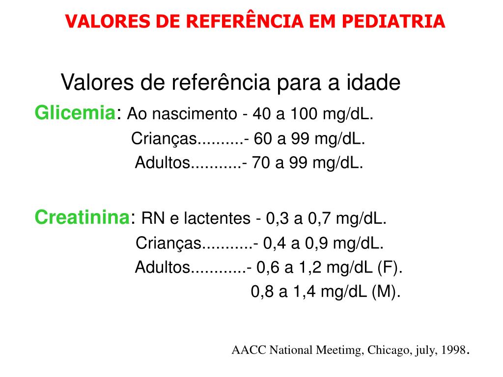 VALORES DE REFERÊNCIA EM PEDIATRIA • Valores de referência para a idade • Glicemia: Ao nascimento - 40 a 100 mg/dL. • Crianças..........- 60 a 99 mg/dL. • Adultos...........- 70 a 99 mg/dL. • Creatinina: RN e lactentes - 0,3 a 0,7 mg/dL. • Crianças...........- 0,4 a 0,9 mg/dL. • Adultos............- 0,6 a 1,2 mg/dL (F). • 0,8 a 1,4 mg/dL (M). AACC National Meetimg, Chicago, july, 1998.