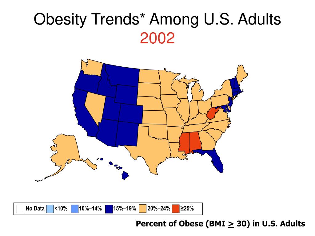 No Data <10% 10%–14% 15%–19% 20%–24% ≥25% Obesity Trends* Among U.S. Adults2002 Percent of Obese (BMI > 30) in U.S. Adults