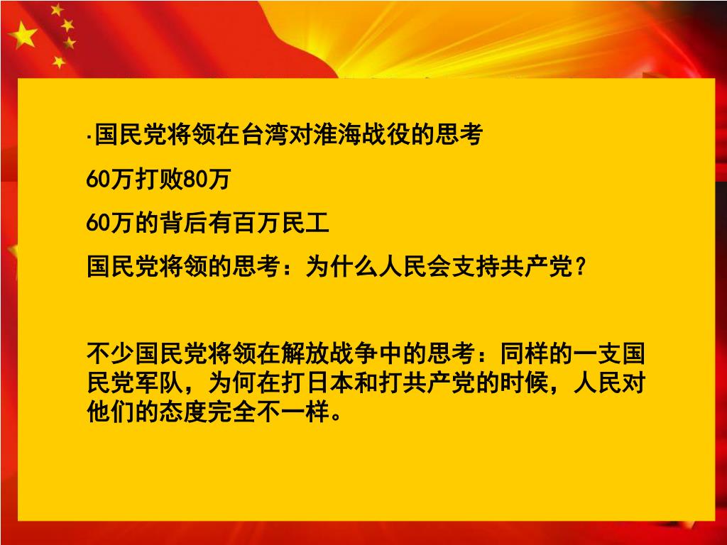 ·国民党将领在台湾对淮海战役的思考 60万打败80万 60万的背后有百万民工 国民党将领的思考:为什么人民会支持共产党? 不少国民党将领在解放战争中的思考:同样的一支国民党军队,为何在打日本和打共产党的时候,人民对他们的态度完全不一样。