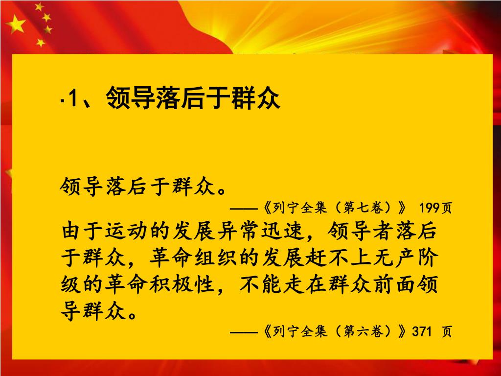 ·1、领导落后于群众 领导落后于群众。 ——《列宁全集(第七卷)》 199页 由于运动的发展异常迅速,领导者落后于群众,革命组织的发展赶不上无产阶级的革命积极性,不能走在群众前面领导群众。 ——《列宁全集(第六卷)》371 页