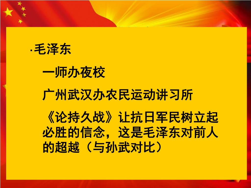·毛泽东 • 一师办夜校 • 广州武汉办农民运动讲习所 • 《论持久战》让抗日军民树立起必胜的信念,这是毛泽东对前人的超越(与孙武对比)
