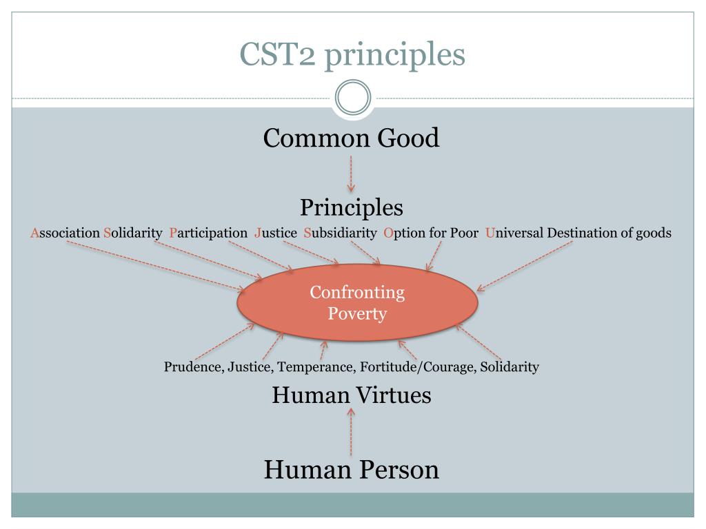 CST2 principles Common Good Principles Association Solidarity Participation Justice Subsidiarity Option for Poor Universal Destination of goods Prudence, Justice, Temperance, Fortitude/Courage, Solidarity Human Virtues Human Person ConfrontingPoverty