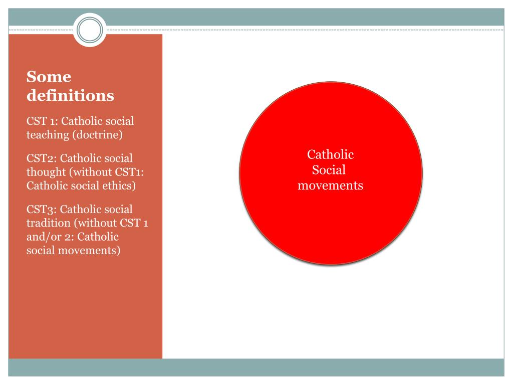 Some definitions CST 3 CST 2 CST 1: Catholic social teaching (doctrine) CST2: Catholic social thought (without CST1: Catholic social ethics) CST3: Catholic social tradition (without CST 1 and/or 2: Catholic social movements) Catholic Social movements Catholic Social ethics CST1