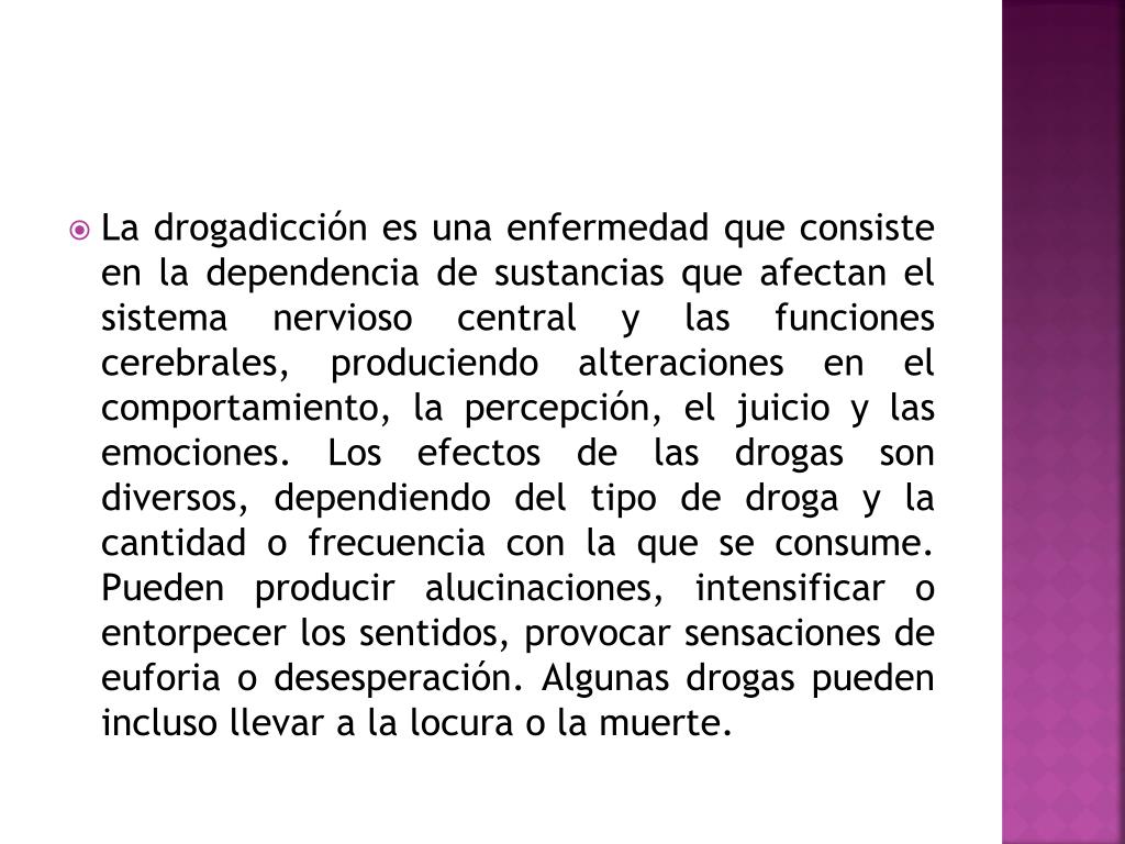 La drogadicción es una enfermedad que consiste en la dependencia de sustancias que afectan el sistema nervioso central y las funciones cerebrales, produciendo alteraciones en el comportamiento, la percepción, el juicio y las emociones. Los efectos de las drogas son diversos, dependiendo del tipo de droga y la cantidad o frecuencia con la que se consume. Pueden producir alucinaciones, intensificar o entorpecer los sentidos, provocar sensaciones de euforia o desesperación. Algunas drogas pueden incluso llevar a la locura o la muerte.