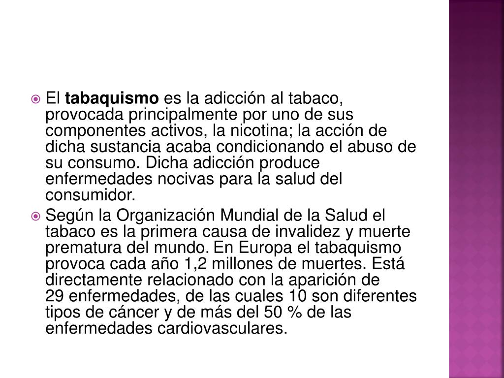 El tabaquismo es la adicción al tabaco, provocada principalmente por uno de sus componentes activos, la nicotina; la acción de dicha sustancia acaba condicionando el abuso de su consumo. Dicha adicción produce enfermedades nocivas para la salud del consumidor. • Según la Organización Mundial de la Salud el tabaco es la primera causa de invalidez y muerte prematura del mundo.En Europa el tabaquismo provoca cada año 1,2 millones de muertes. Está directamente relacionado con la aparición de 29 enfermedades, de las cuales 10 son diferentes tipos de cáncer y de más del 50 % de las enfermedades cardiovasculares.
