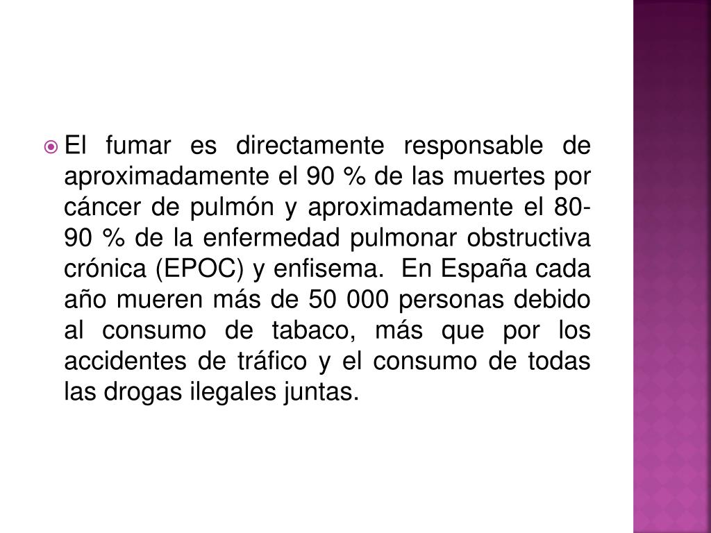 El fumar es directamente responsable de aproximadamente el 90 % de las muertes por cáncer de pulmón y aproximadamente el 80-90 % de la enfermedad pulmonar obstructiva crónica (EPOC) y enfisema. En España cada año mueren más de 50 000 personas debido al consumo de tabaco, más que por los accidentes de tráfico y el consumo de todas las drogas ilegales juntas.