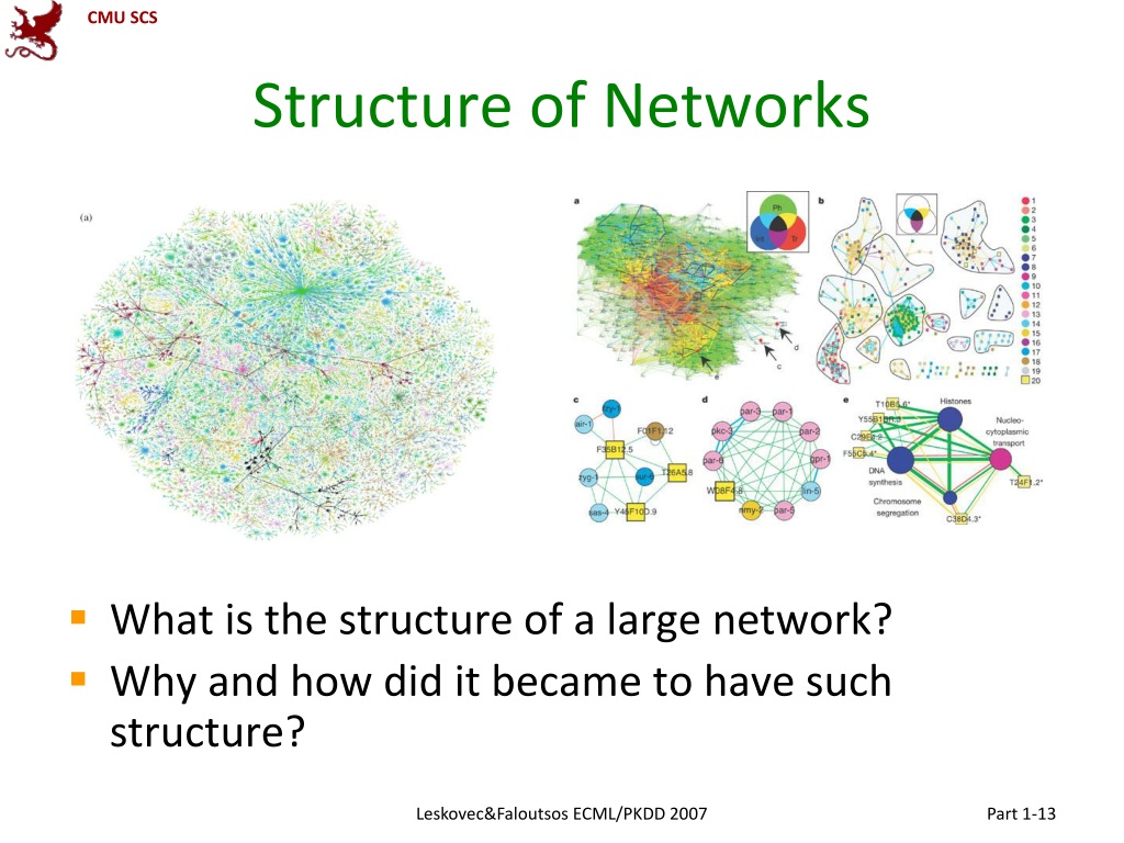 Part 1: Outline • 1.1: Structural properties • What are the statistical properties of static and time evolving networks? • 1.2: Models • How do we build models of network generations of evolution? • 1.3: Fitting the models • How do we fit models? • How do we generate realistic looking graphs? Leskovec&Faloutsos ECML/PKDD 2007