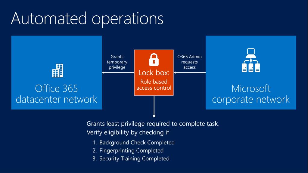 Automated operations Office 365 datacenter network Microsoft corporate network Lock box: Role based access control Grants temporary privilege O365 Adminrequests access Grants least privilege required to complete task. Verify eligibility by checking if Background Check Completed Fingerprinting Completed Security Training Completed