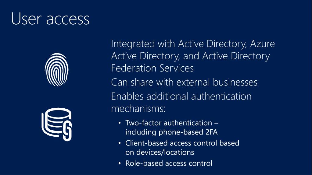 User access • Integrated with Active Directory, Azure Active Directory, and Active Directory Federation Services • Can share with external businesses • Enables additional authentication mechanisms: • Two-factor authentication – including phone-based 2FA • Client-based access control based on devices/locations • Role-based access control