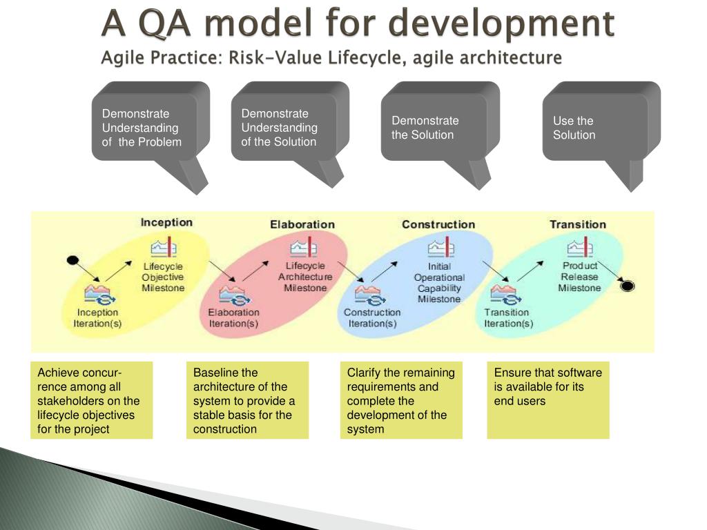 A QA model for developmentAgile Practice: Risk-Value Lifecycle, agile architecture Demonstrate Understanding of the Solution Demonstrate the Solution Demonstrate Understanding of the Problem Use the Solution Achieve concur-rence among all stakeholders on the lifecycle objectives for the project Baseline the architecture of the system to provide a stable basis for the construction Clarify the remaining requirements and complete the development of the system Ensure that software is available for its end users
