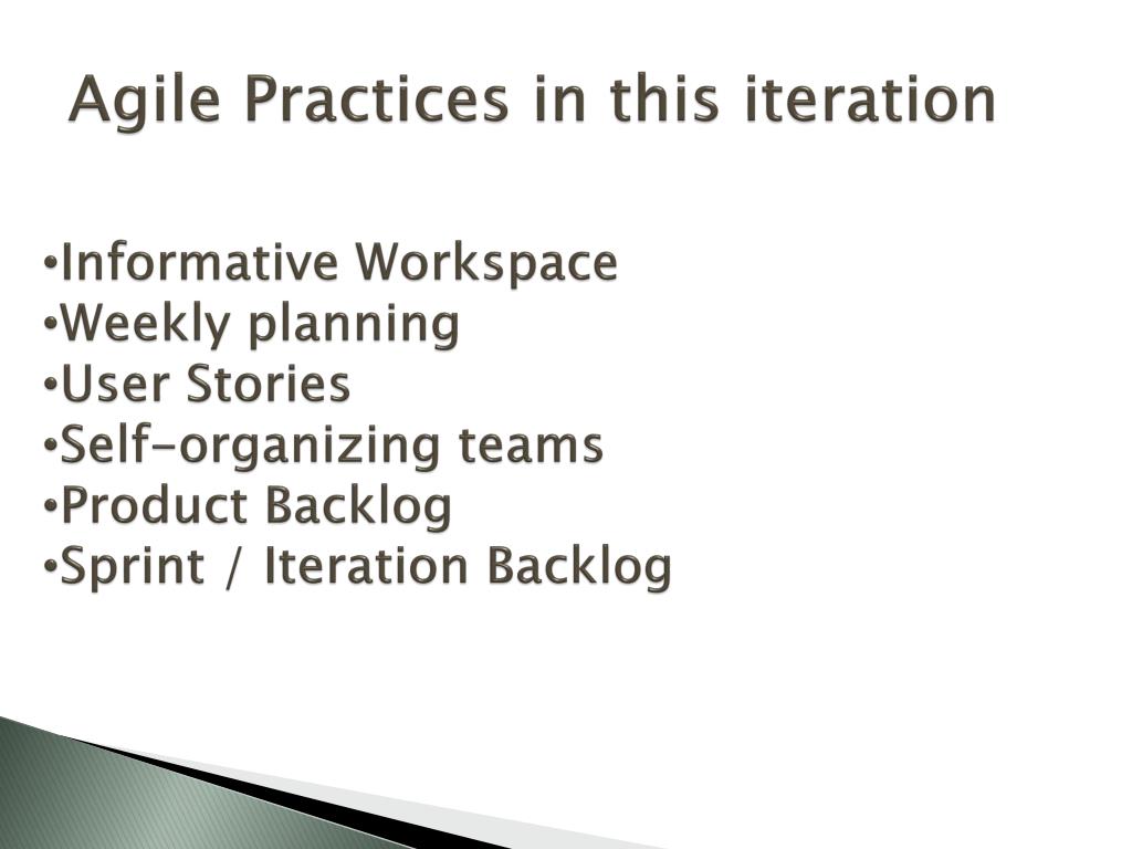 Agile Practices in this iteration • Informative Workspace • Weeklyplanning • User Stories • Self-organizing teams • ProductBacklog • Sprint / Iteration Backlog