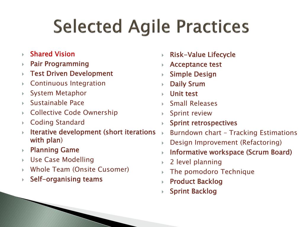Selected Agile Practices • Shared Vision • Pair Programming • Test Driven Development • Continuous Integration • System Metaphor • Sustainable Pace • CollectiveCodeOwnership • Coding Standard • Iterative development (short iterationswith plan) • Planning Game • Use Case Modelling • Whole Team (OnsiteCusomer) • Self-organising teams • Risk-ValueLifecycle • Acceptance test • Simple Design • DailySrum • Unit test • Small Releases • Sprint review • Sprint retrospectives • Burndown chart – Tracking Estimations • Design Improvement (Refactoring) • Informative workspace (ScrumBoard) • 2 levelplanning • The pomodoroTechnique • ProductBacklog • Sprint Backlog