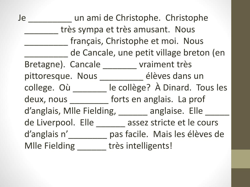 Je _________ un ami de Christophe. Christophe _______ très sympa et très amusant. Nous _________ français, Christophe et moi. Nous _________ de Cancale, une petit village breton (en Bretagne). Cancale _______ vraiment très pittoresque. Nous _________ élèves dans un college. Où _______ le collège? À Dinard. Tous les deux, nous ________ forts en anglais. La prof d’anglais, Mlle Fielding, ______ anglaise. Elle _____ de Liverpool. Elle ______ assez stricte et le cours d’anglais n’________ pas facile. Mais les élèves de Mlle Fielding ______ très intelligents!
