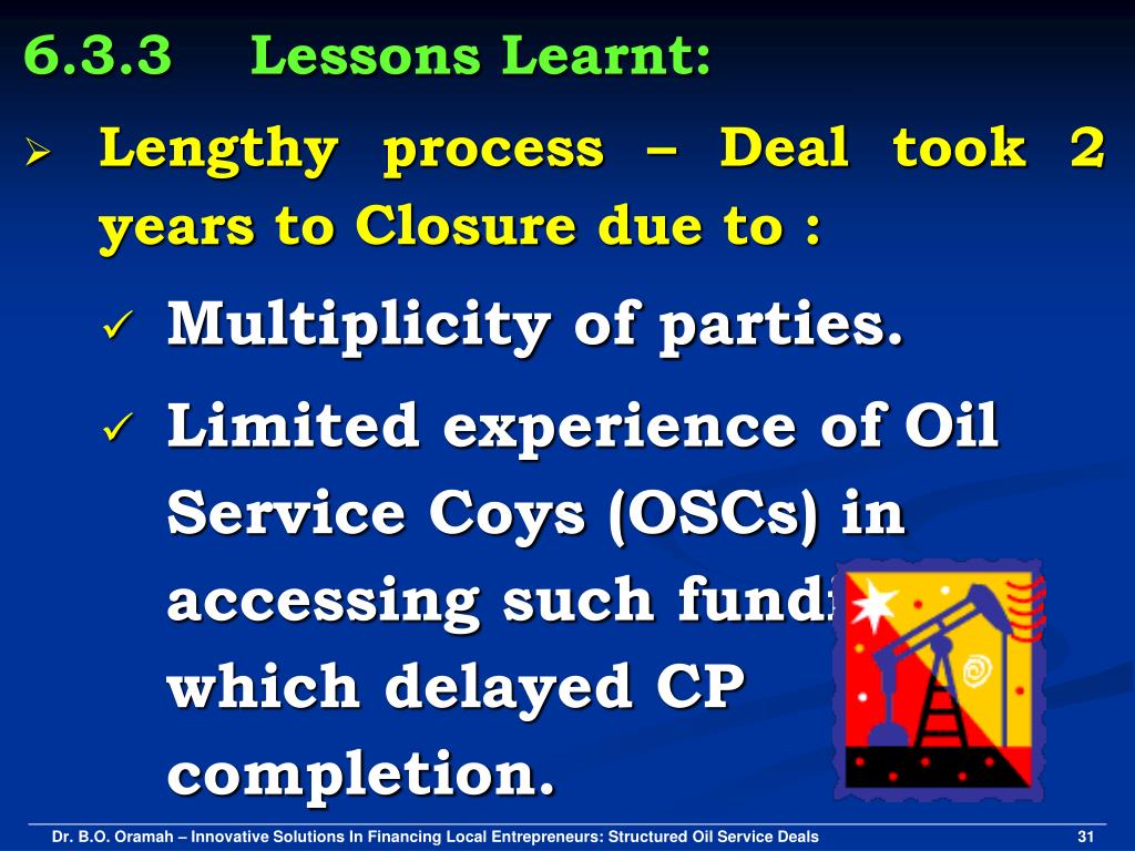 6.3.3 Lessons Learnt: • Lengthy process – Deal took 2 years to Closure due to : • Multiplicity of parties. • Limited experience of Oil Service Coys (OSCs) in accessing such funding which delayed CP completion.