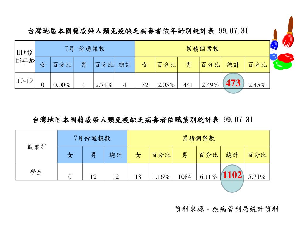 學生感染 HIV/AIDS 相關社會資源、轉介及提高校園輸血安全. 吳珮瑄 社工 99.09.03. 資料來源:疾病管制局統計資料. 愛滋病 學生族群首度超過服務業. 15 到 24 歲年輕族群感染者增加,去年 1 年新感染者比前年多了近 1 成 8 。. 衛生署疾病管制局分析前年上半年,捐血中心檢出的愛滋陽性個案 46 人, 20 到 29 歲的年輕人就占了 31 人,有 2 人甚至只有十幾歲。 學生族群還首度超過服務業 (不包括性工作者),占了近 2 成 2 。.