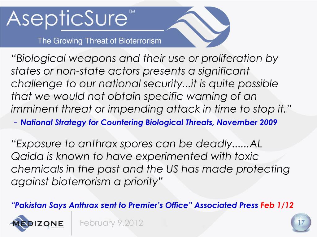 The Growing Threat of Bioterrorism “Biological weapons and their use or proliferation by states or non-state actors presents a significant challenge to our national security...it is quite possible that we would not obtain specific warning of an imminent threat or impending attack in time to stop it.” - National Strategy for Countering Biological Threats, November 2009 “Exposure to anthrax spores can be deadly......AL Qaida is known to have experimented with toxic chemicals in the past and the US has made protecting against bioterrorism a priority” “Pakistan Says Anthrax sent to Premier’s Office” Associated Press Feb 1/12 .
