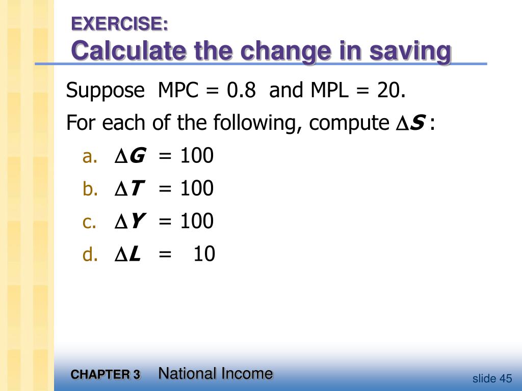 EXERCISE: Calculate the change in saving Suppose MPC = 0.8 and MPL = 20. For each of the following, compute S : • G = 100 • T = 100 • Y = 100 • L = 10
