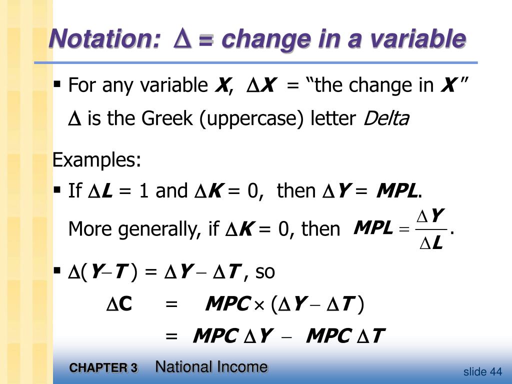 Notation: = change in a variable • For any variable X, X = “the change in X ” is the Greek (uppercase) letter Delta Examples: • If L = 1 and K = 0, then Y = MPL. More generally, if K = 0, then • (YT )= Y T , so C = MPC (Y T ) = MPC Y MPC T