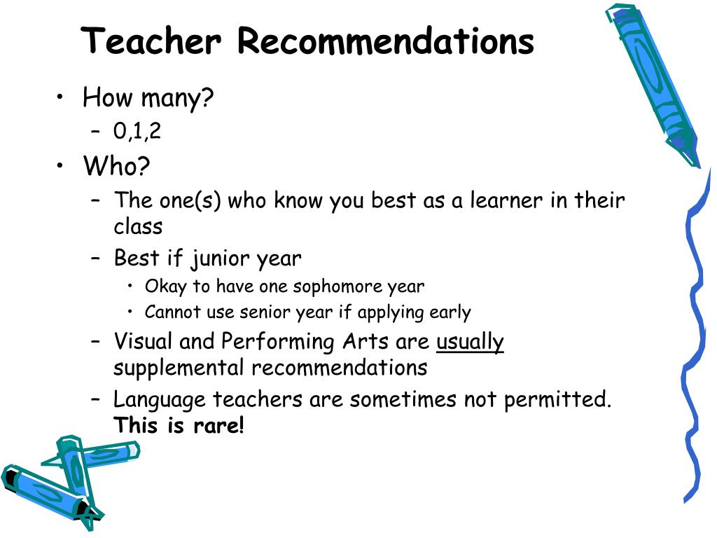 Teacher Recommendations • How many? • 0,1,2 • Who? • The one(s) who know you best as a learner in their class • Best if junior year • Okay to have one sophomore year • Cannot use senior year if applying early • Visual and Performing Arts are usually supplemental recommendations • Language teachers are sometimes not permitted. This is rare!