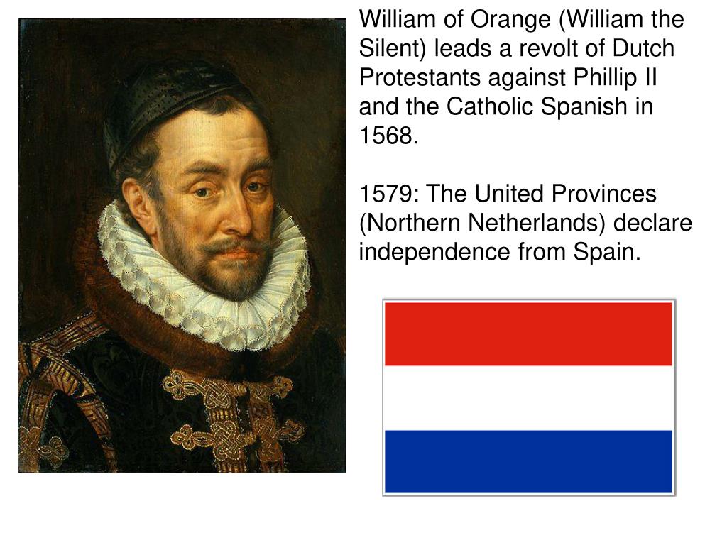 William of Orange (William the Silent) leads a revolt of Dutch Protestants against Phillip II and the Catholic Spanish in 1568. 1579: The United Provinces (Northern Netherlands) declare independence from Spain.