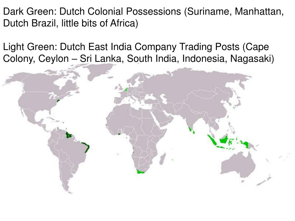Dark Green: Dutch Colonial Possessions (Suriname, Manhattan, Dutch Brazil, little bits of Africa) Light Green: Dutch East India Company Trading Posts (Cape Colony, Ceylon – Sri Lanka, South India, Indonesia, Nagasaki)