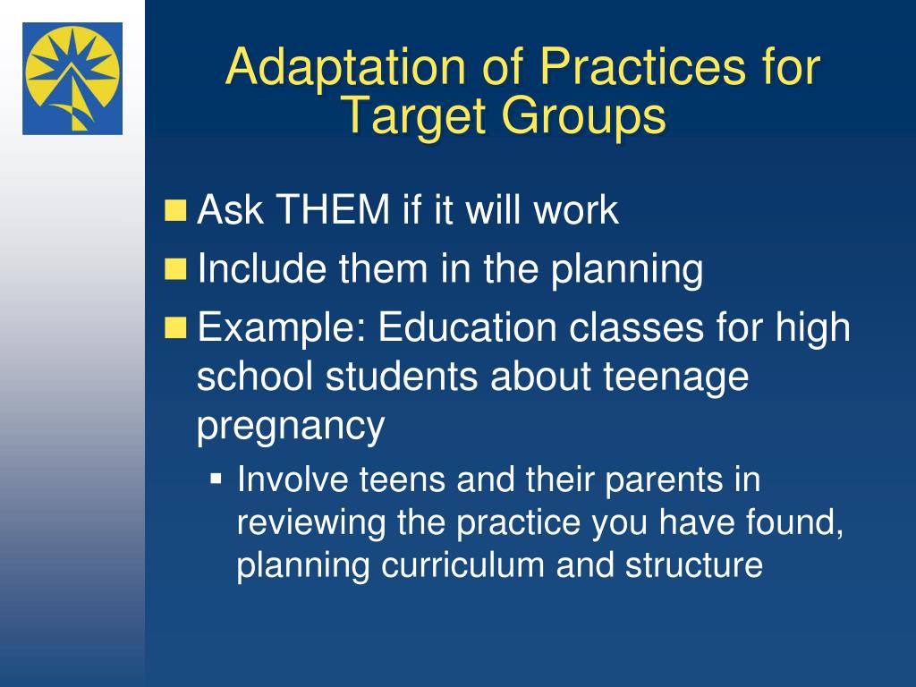 Adaptation of Practices for Target Groups • Ask THEM if it will work • Include them in the planning • Example: Education classes for high school students about teenage pregnancy • Involve teens and their parents in reviewing the practice you have found, planning curriculum and structure