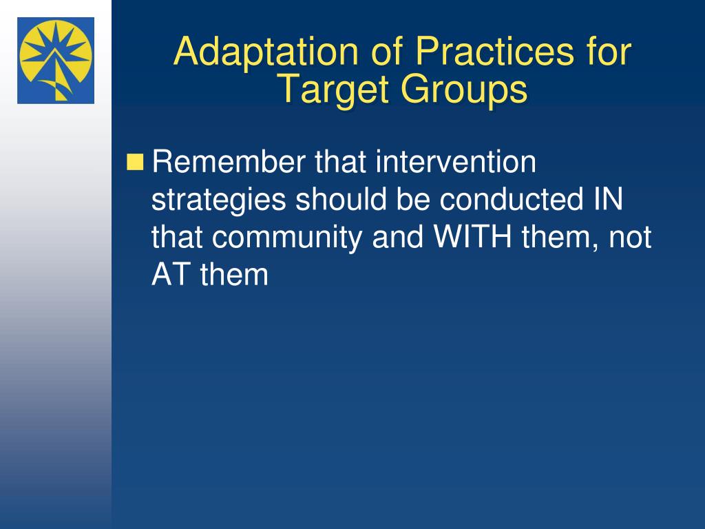 Adaptation of Practices for Target Groups • Remember that intervention strategies should be conducted IN that community and WITH them, not AT them