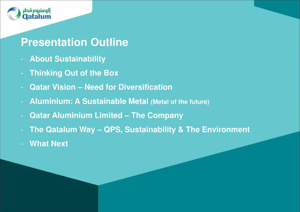Presentation Outline • About Sustainability • Thinking Out of the Box • Qatar Vision –Need for Diversification • Aluminium: A Sustainable Metal (Metal of the future) • Qatar Aluminium Limited – The Company • The Qatalum Way – QPS, Sustainability & The Environment • What Next