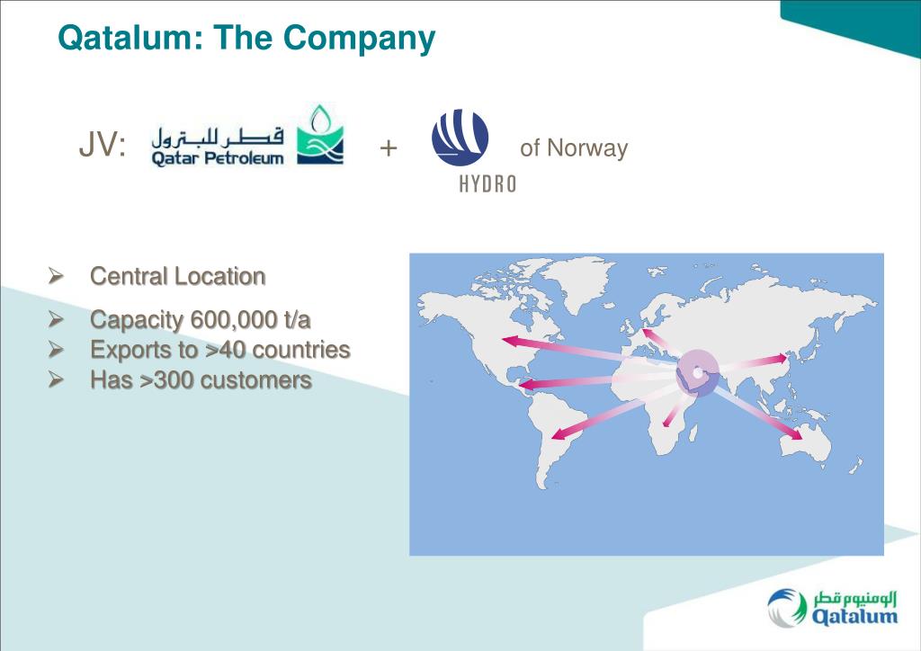 Qatalum: The Company JV: + of Norway • Central Location • Capacity 600,000 t/a • Exports to >40 countries • Has >300 customers