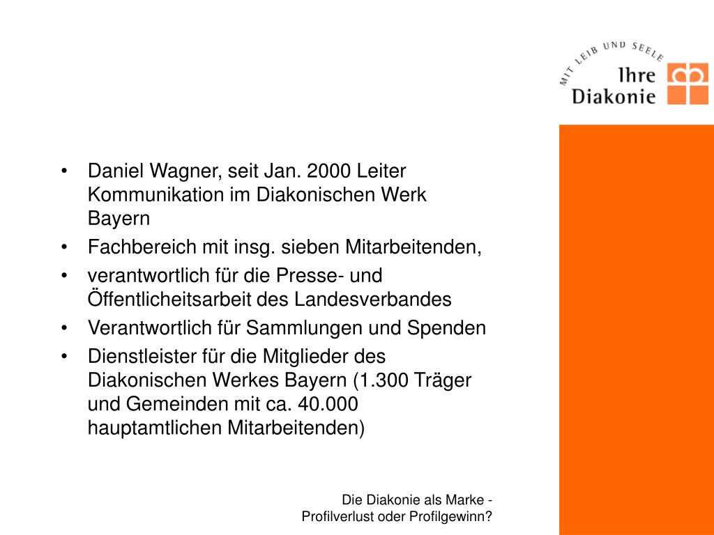 Die Diakonie als Marke. Profilverlust oder Profilgewinn? Berlin, 28.10.03. Daniel Wagner, seit Jan. 2000 Leiter Kommunikation im Diakonischen Werk Bayern Fachbereich mit insg. sieben Mitarbeitenden, verantwortlich für die Presse- und Öffentlicheitsarbeit des Landesverbandes