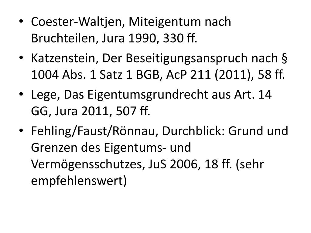 Coester-Waltjen, Miteigentum nach Bruchteilen, Jura 1990, 330 ff. • Katzenstein, Der Beseitigungsanspruch nach § 1004 Abs. 1 Satz 1 BGB, AcP 211 (2011), 58 ff. • Lege, Das Eigentumsgrundrecht aus Art. 14 GG, Jura 2011, 507 ff. • Fehling/Faust/Rönnau, Durchblick: Grund und Grenzen des Eigentums- und Vermögensschutzes, JuS 2006, 18 ff. (sehr empfehlenswert)