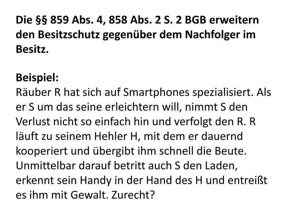 Die §§ 859 Abs. 4, 858 Abs. 2 S. 2 BGB erweitern den Besitzschutz gegenüber dem Nachfolger im Besitz. Beispiel: Räuber R hat sich auf Smartphones spezialisiert. Als er S um das seine erleichtern will, nimmt S den Verlust nicht so einfach hin und verfolgt den R. R läuft zu seinem Hehler H, mit dem er dauernd kooperiert und übergibt ihm schnell die Beute. Unmittelbar darauf betritt auch S den Laden, erkennt sein Handy in der Hand des H und entreißt es ihm mit Gewalt. Zurecht?