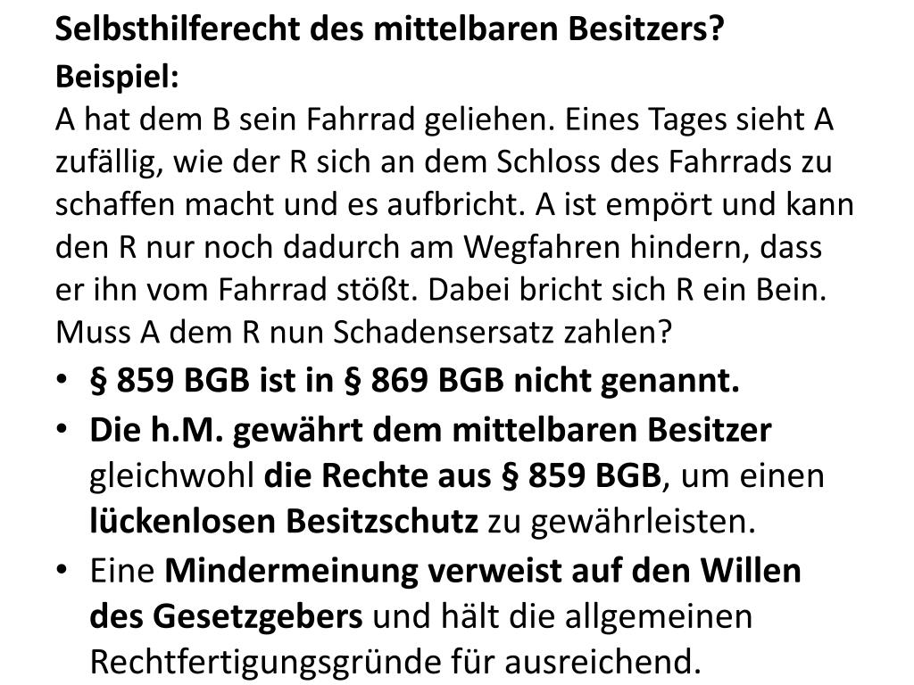 Selbsthilferecht des mittelbaren Besitzers? Beispiel:A hat dem B sein Fahrrad geliehen. Eines Tages sieht A zufällig, wie der R sich an dem Schloss des Fahrrads zu schaffen macht und es aufbricht. A ist empört und kann den R nur noch dadurch am Wegfahren hindern, dass er ihn vom Fahrrad stößt. Dabei bricht sich R ein Bein. Muss A dem R nun Schadensersatz zahlen? • § 859 BGB ist in § 869 BGB nicht genannt. • Die h.M. gewährt dem mittelbaren Besitzer gleichwohl die Rechte aus § 859 BGB, um einen lückenlosen Besitzschutz zu gewährleisten. • Eine Mindermeinung verweist auf den Willen des Gesetzgebers und hält die allgemeinen Rechtfertigungsgründe für ausreichend.