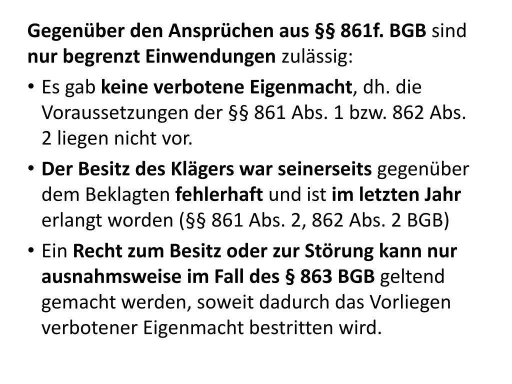 Gegenüber den Ansprüchen aus §§ 861f. BGB sind nur begrenzt Einwendungen zulässig: • Es gab keine verbotene Eigenmacht, dh. die Voraussetzungen der §§ 861 Abs. 1 bzw. 862 Abs. 2 liegen nicht vor. • Der Besitz des Klägers war seinerseits gegenüber dem Beklagten fehlerhaft und ist im letzten Jahr erlangt worden (§§ 861 Abs. 2, 862 Abs. 2 BGB) • Ein Recht zum Besitz oder zur Störung kann nur ausnahmsweise im Fall des § 863 BGB geltend gemacht werden, soweit dadurch das Vorliegen verbotener Eigenmacht bestritten wird.