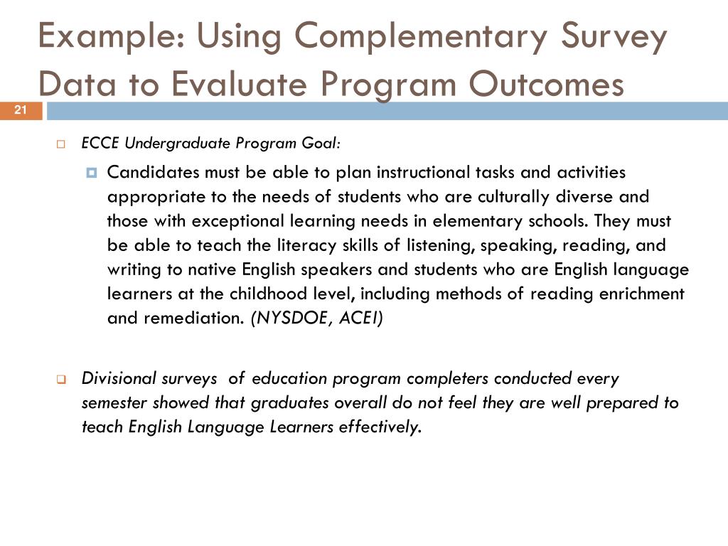 Example: Using Complementary Survey Data to Evaluate Program Outcomes • ECCE Undergraduate Program Goal: • Candidates must be able to plan instructional tasks and activities appropriate to the needs of students who are culturally diverse and those with exceptional learning needs in elementary schools. They must be able to teach the literacy skills of listening, speaking, reading, and writing to native English speakers and students who are English language learners at the childhood level, including methods of reading enrichment and remediation. (NYSDOE, ACEI) • Divisional surveys of education program completers conducted every semester showed that graduates overall do not feel they are well prepared to teach English Language Learners effectively.