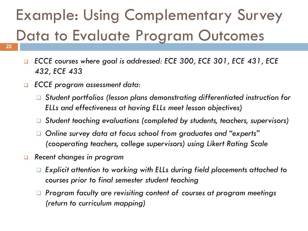 Example: Using Complementary Survey Data to Evaluate Program Outcomes • ECCE courses where goal is addressed: ECE 300, ECE 301, ECE 431, ECE 432, ECE 433 • ECCE program assessment data: • Student portfolios (lesson plans demonstrating differentiated instruction for ELLs and effectiveness at having ELLs meet lesson objectives) • Student teaching evaluations (completed by students, teachers, supervisors) • Online survey data at focus school from graduates and “experts” (cooperating teachers, college supervisors) using Likert Rating Scale • Recent changes in program • Explicit attention to working with ELLs during field placements attached to courses prior to final semester student teaching • Program faculty are revisiting content of courses at program meetings (return to curriculum mapping)