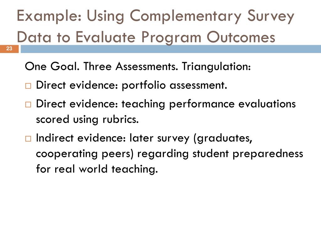 Example: Using Complementary Survey Data to Evaluate Program Outcomes One Goal. Three Assessments. Triangulation: • Direct evidence: portfolio assessment. • Direct evidence: teaching performance evaluations scored using rubrics. • Indirect evidence: later survey (graduates, cooperating peers) regarding student preparedness for real world teaching.