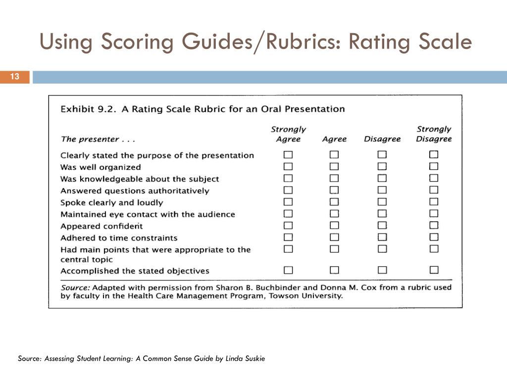 Using Scoring Guides/Rubrics: Rating Scale Source: Assessing Student Learning: A Common Sense Guide by Linda Suskie