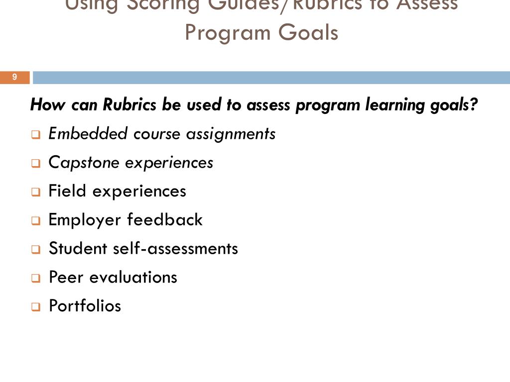 Using Scoring Guides/Rubrics to Assess Program Goals How can Rubrics be used to assess program learning goals? • Embedded course assignments • Capstone experiences • Field experiences • Employer feedback • Student self-assessments • Peer evaluations • Portfolios