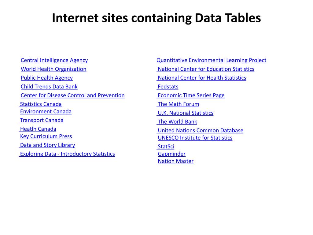 Internet sites containing Data Tables Central Intelligence Agency World Health Organization Public Health Agency Child Trends Data Bank Center for Disease Control and Prevention Statistics CanadaEnvironment Canada Transport Canada HeatlhCanadaKey Curriculum Press Data and Story Library Exploring Data - Introductory Statistics Quantitative Environmental Learning Project National Center for Education Statistics National Center for Health Statistics Fedstats Economic Time Series Page The Math Forum U.K. National Statistics The World Bank United Nations Common DatabaseUNESCO Institute for Statistics StatSciGapminderNation Master